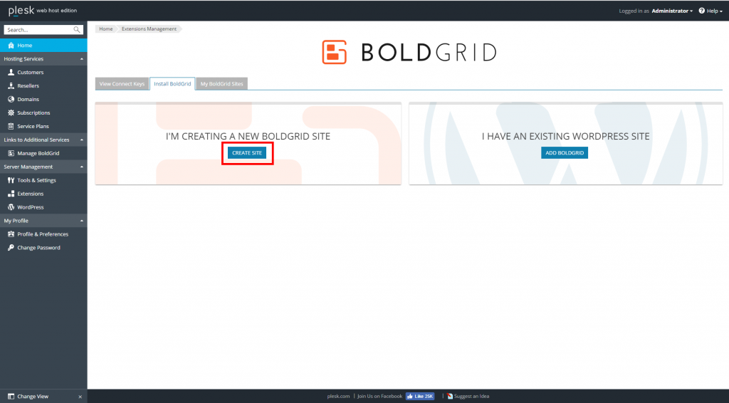 Click on the Create Site button on the “I’m creating a new BoldGrid site” option.