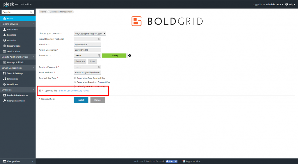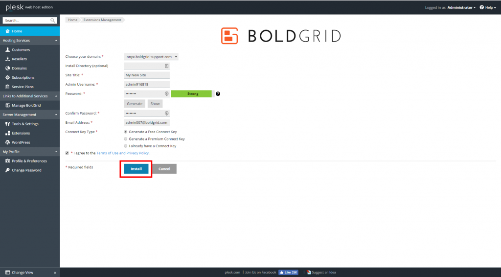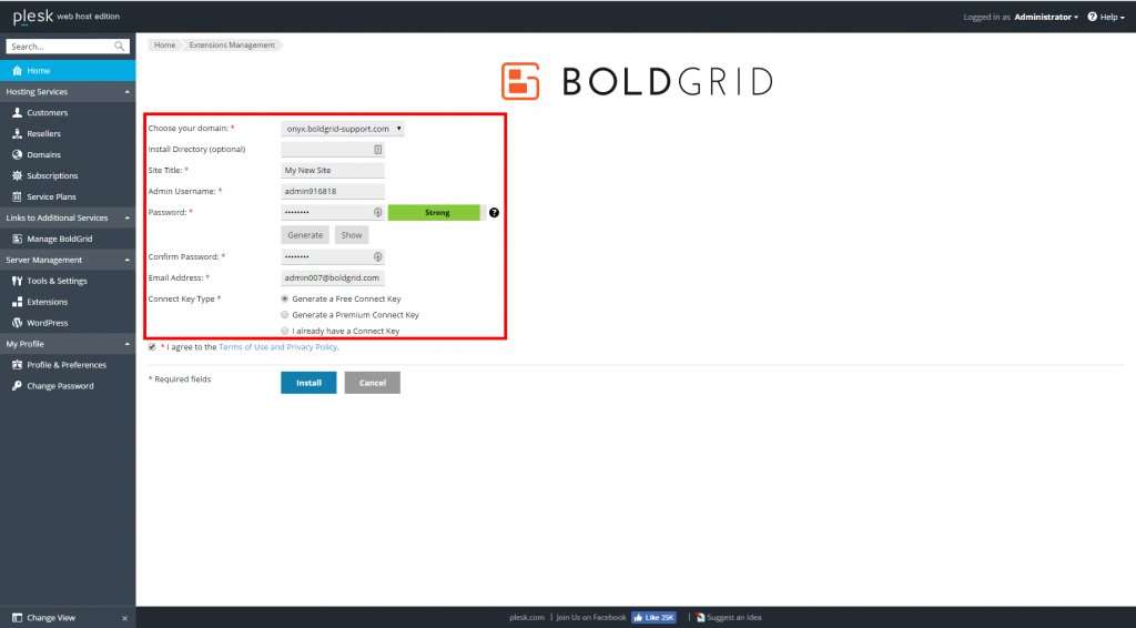 Complete the installation settings form.Choose your domain Select the target domain from the dropdown. Remember that only domains owned by the Administrator will appear. Install Directory (optional) If you wish to install BoldGrid into a subfolder, enter the subfolder name here. If it is to be installed on the domain itself, leave it blank. Site Title Give your site a name. Admin Username An admin name is created for you. You can either keep it or replace it with your own. Password Create a strong password. You can either enter your own or have one created by clicking the Generate button. Confirm Password Enter the same password as you created above. Email Address Enter an email address. This is where any notifications from the server will be sent. Connect Key Type Select your Connect key type.