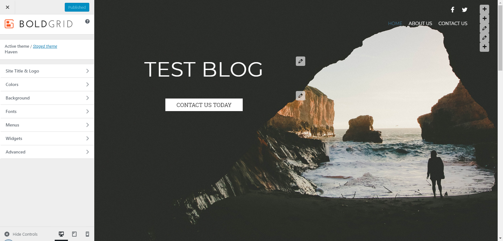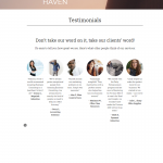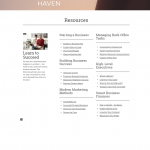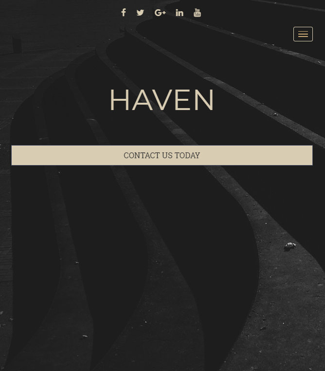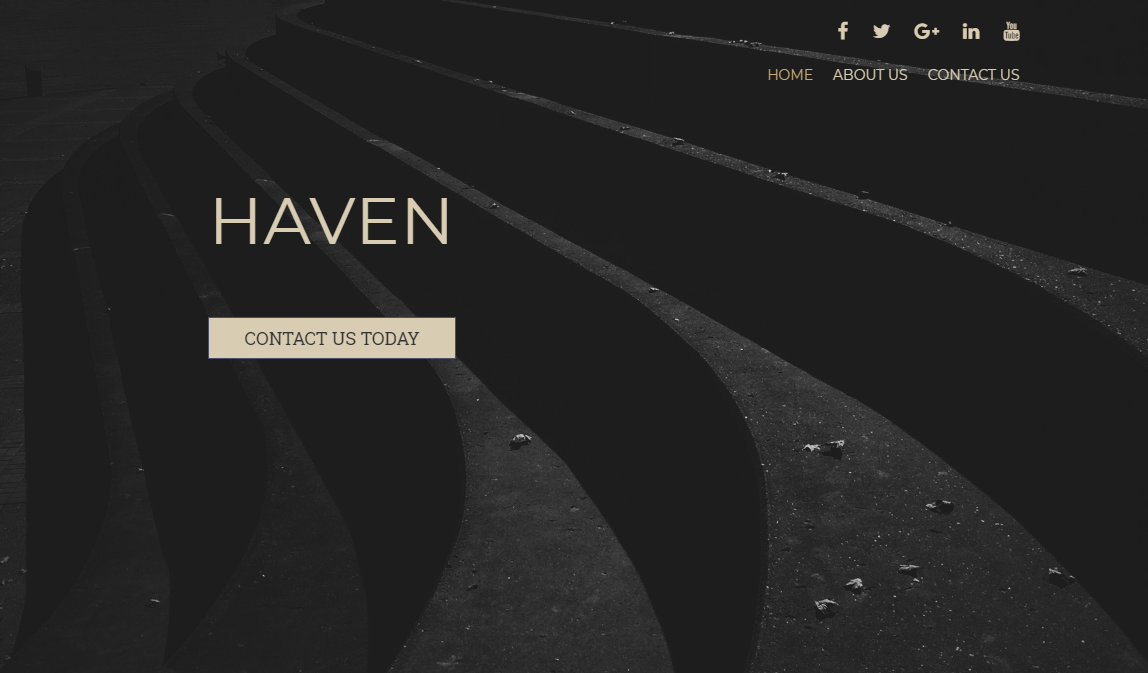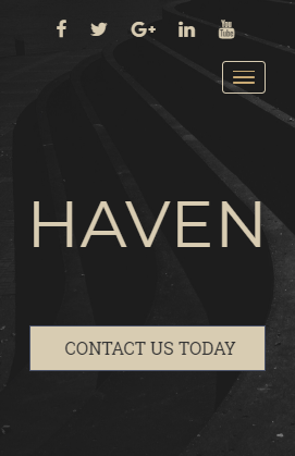 The Haven home page is dominated by a large background image, a title set to a 66 point font and a call to action that is highlighted – both of which use all capital letters and is set to the left half of the page. The social media icons are set in the top right corner along with the site menu. The design for the home page is very sparse so that the main focus is the background image. The image is set to a size of 1920×1080 pixels and is fixed. This fixed setting means that the image will not move when you scroll up or down the page. Below you can see the different ways that the Haven Inspiration appears when you view the home page in different sizes: