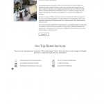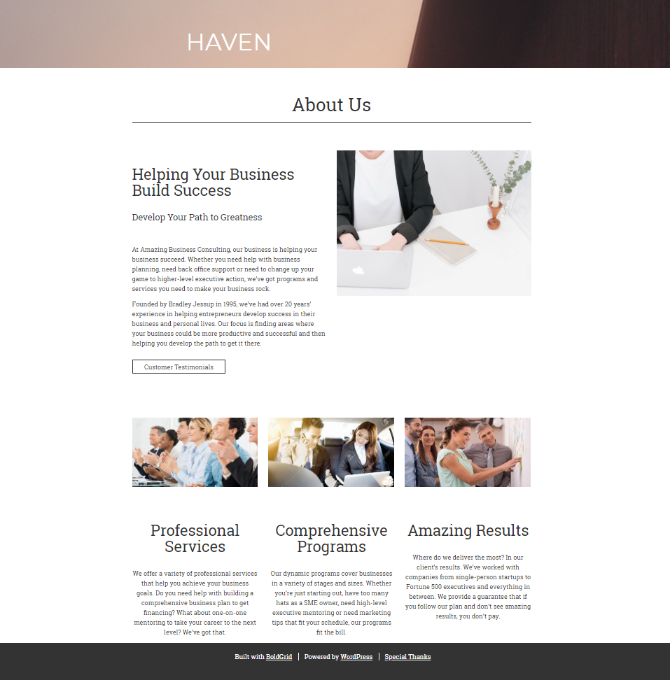 We are previewing this Inspiration using the base pageset which includes 3 pages. The About Us page includes a space for a column of text, an image, a button to jump to another page (the customer testimonial button in the screenshot above), and three columns below it. Each column contains an image and paragraph of text below it. The About Us page is framed by a portion of the Home page image at the top and the attribution bar at the footer of the page. The attributions in the footer include the “Built with BoldGrid”, “Powered by WordPress”, and “Special Thanks”. Each of these items can be removed with the customization options.