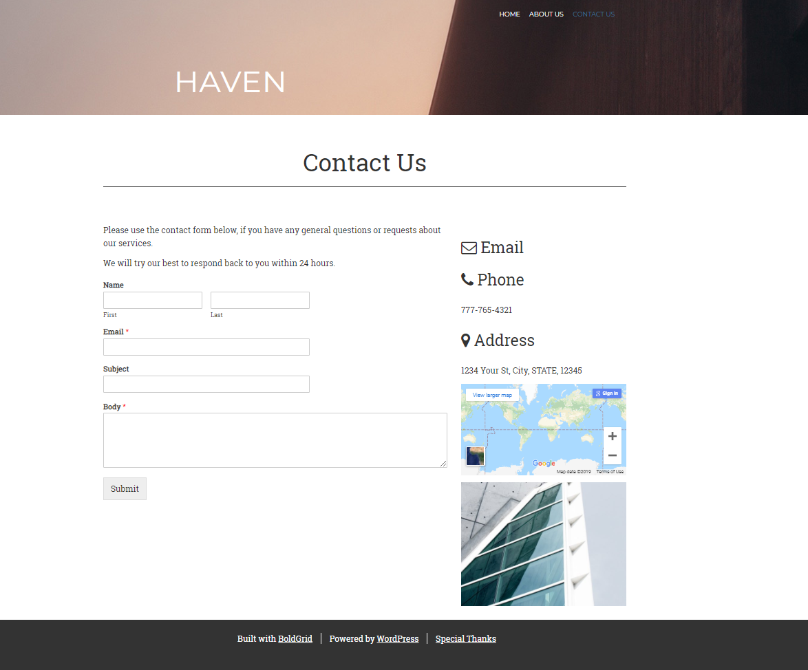 The Contact Us page uses a form that allows people to contact you. The form page also includes an email address, phone number, address map and a graphic. You can change this information by editing the page.