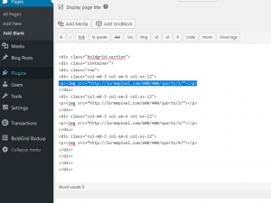 After mastering the basic structure of a Block, the next step is to add content to your Block within the columns you have laid out. The following guide will walk you through adding content that uses the responsive breakpoints set up within the Boldgrid Theme Framework. We will be using the following example Block that will show 4 full width columns on your phone, 2 rows with 2 columns in each on your tablet, and 1 row with 4 columns on your desktop.