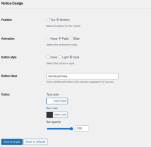 - Jesse Owens Keymaster- Hi Lance- - Thanks for the great question, and thanks for using the Crio WordPress theme for business. - As far as I’m aware, most or all of the GDPR/CCPA plugins available on the WordPress repository should be compatible with Crio out-of-the box. - The most popular one, and the one we use here on BoldGrid.com, is Cookie Notice & Compliance. It offers CSS-free customization of the colors, and also allows you to specify a CSS class for the “OK” button, so you can easily make it match your color scheme and match the buttons on the rest of your website by using the class - button-primary, like so: