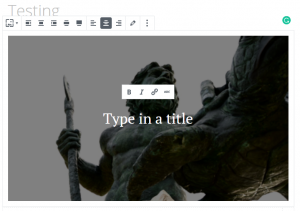 When the image is selected it will be faded out so that the title stands out. You will see a blinking cursor where you can type your title. Remember that the title goes across the image. Type in your cover image title. You also have several options for alignment in the to left corner tool bar. - If you are finished with the Cover Image block, you can then click on Publish or Update to save your work.