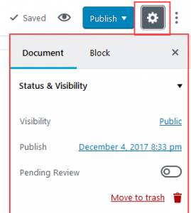 The Publish option lets you determine the visibility options for the post/page as well as the option to schedule it for a later date if you don’t want to publish it immediately.